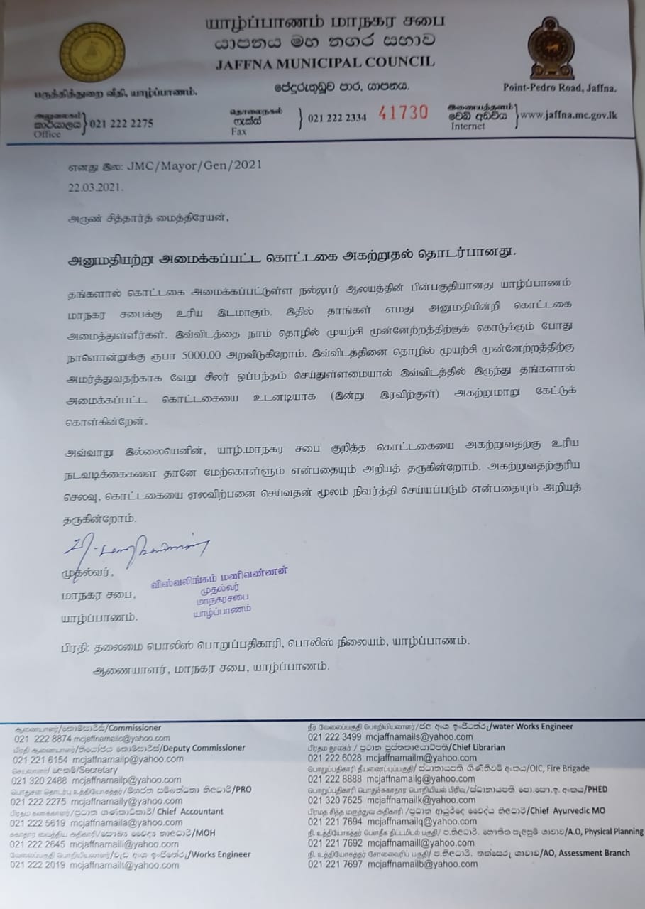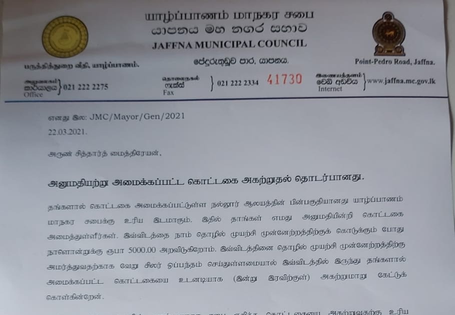 Dalam kasus ini, konselor dan pejabat keluar untuk mengeluarkan surat tertulis kepada Walikota Jaffna yang menyatakan bahwa adalah kesalahan membangun gudang tanpa izin hari ini dan harus segera dipindahkan malam ini.