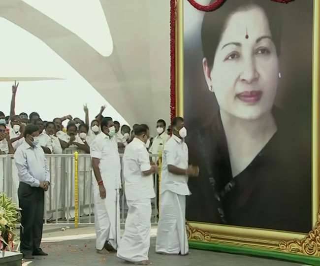 Tiga pemimpin memberi penghormatan tinggi kepada Jayalalitha di dekat tugu peringatan tersebut. Balanisami dan Banner Silvam bersama-sama meletakkan batu fondasi untuk tugu Jayalalitha pada Mei 2018. Tugu peringatan Jayalalithaa terletak di dekat tugu peringatan kepada pendiri partai dan mendiang ibu negara MG Ramachandran di Pantai Marina . Pertemuan tersebut dihadiri oleh para menteri, anggota parlemen, MLA dan pimpinan partai.