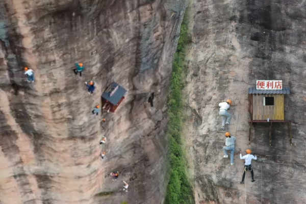 Itu terletak di ketinggian 392 kaki di sisi tebing. Ini disebut sebagai toko serba ada Magnet paling tidak nyaman di dunia, yang dibuka pada tahun 2018 di Taman Geografis Nasional Xinyuzhai, Kabupaten Pingjiang, Provinsi Hunan.